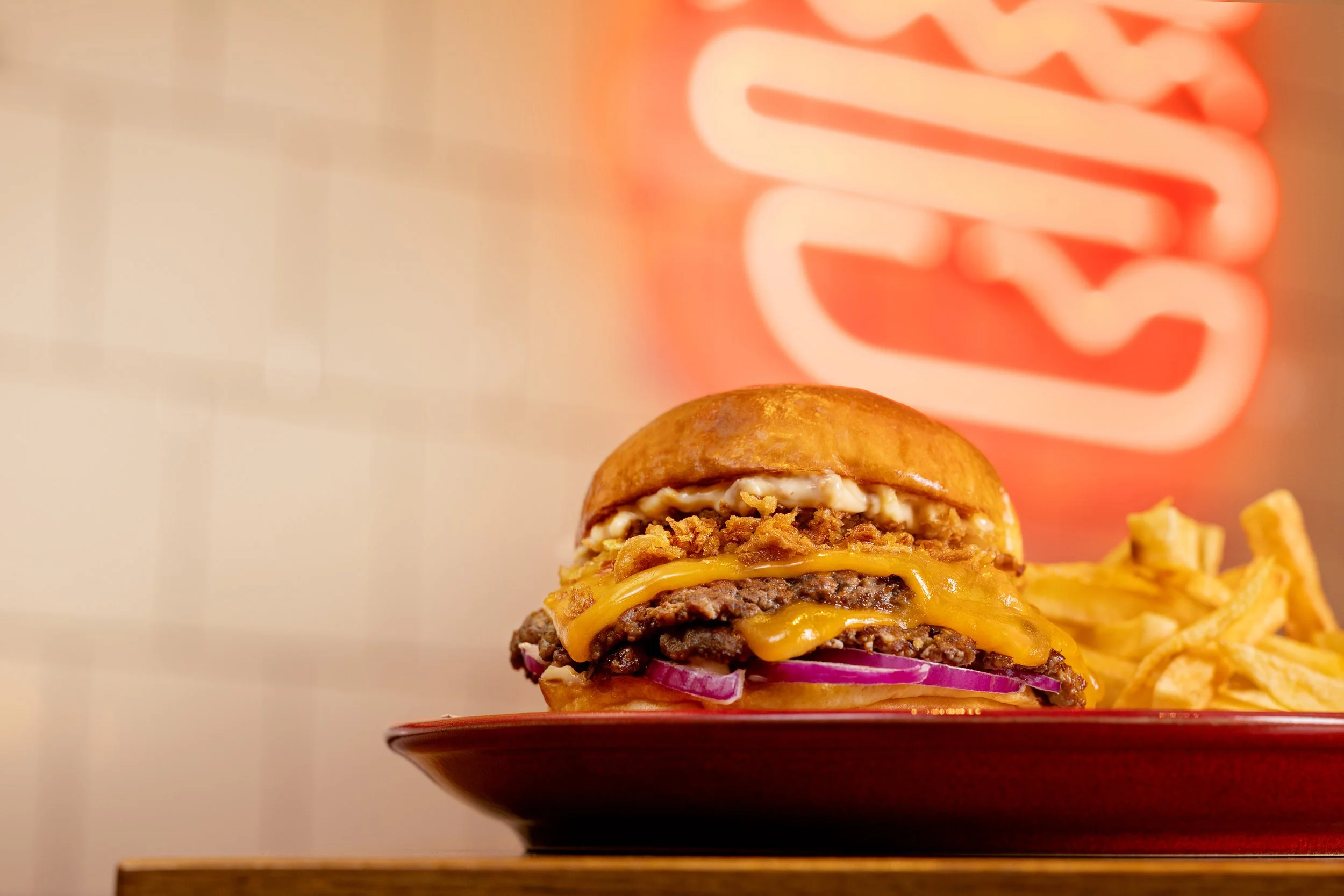 Este hambúrguer sazonal conta com dois smash burgers, cebola frita, cebola roxa, queijo cheddar e maionese de alho.